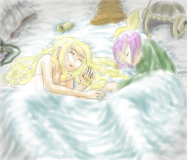 いや、待ってください。落ち着いて聴いてくださいよ? 割と有名な話だと思いますが、バラは様々な色の花をつけることで知られていますが、なぜ青いバラはないのかと長年その青いバラを作り出すことに注力されていました。そして最近になって人工的に青いバラを咲かせることに成功したんです。 ということはですよ? 現代の科学力ならば、ちょっと本気を出せば"あの"青い彼岸花も現実のものとしてこの世に作り出せるわけです。なんてことだ、このままだと星原さんがこの現実界に舞い降りる日もそう遠くない未来にあり得るってことじゃないか! ハレルヤ! 上岡君、今日も空には雲が浮かんでいますよ。 ・・・・・・うん、ちょっと煮詰まってるんです。自分でもちょっとやりすぎな気もしますが、クロノトリガーは面白いし、マールとルッカの寝姿ドットは最高に艶やかだし、ゼノギアスとの類似点を見つけるのも楽しいし、結構充実してるんです。だがしかし、その煽りで絵を描いていないことが、こう、不安というか、落ち着かないというか。目的もテーマもなくタダ漏れの絵を描くこともあまりしたくはないんですが、一時期擬人化を描きまくってたせいで、描かない期間が開いてくると半ば強迫観念じみたものが襲い掛かってくるんですよ。いっそなんとなくでも描いてみようかと昨日ペンをとってみたんですが、とても酷いことになったのでやっぱり中途半端な気持ちはよくありませんです、はい。でも、それでも描かずにはいられないので、また2、3日のうちにネタを見つけて描くんでしょう。アップするかはわかりませんけどね! 勿体無いと思ってかまわずアップしそうだけど! 頑張ります。 しかしこういう絵を描くと、画像形式変換時の圧縮で筆のタッチが潰れてしまうのが勿体無くてしょうがないなあ。さすがに無圧縮だと非常識なファイルサイズになるからできないんですけどね。ちょうどいい線引きというのが未だにうまくできません。 あ、あと今回気付いたら無駄に壁紙原寸サイズで描いてたんですが、ちょっと設定してみたらあまりのケバさに目をやられそうになったので、壁紙サイズでのアップは無しってことでひとつ。